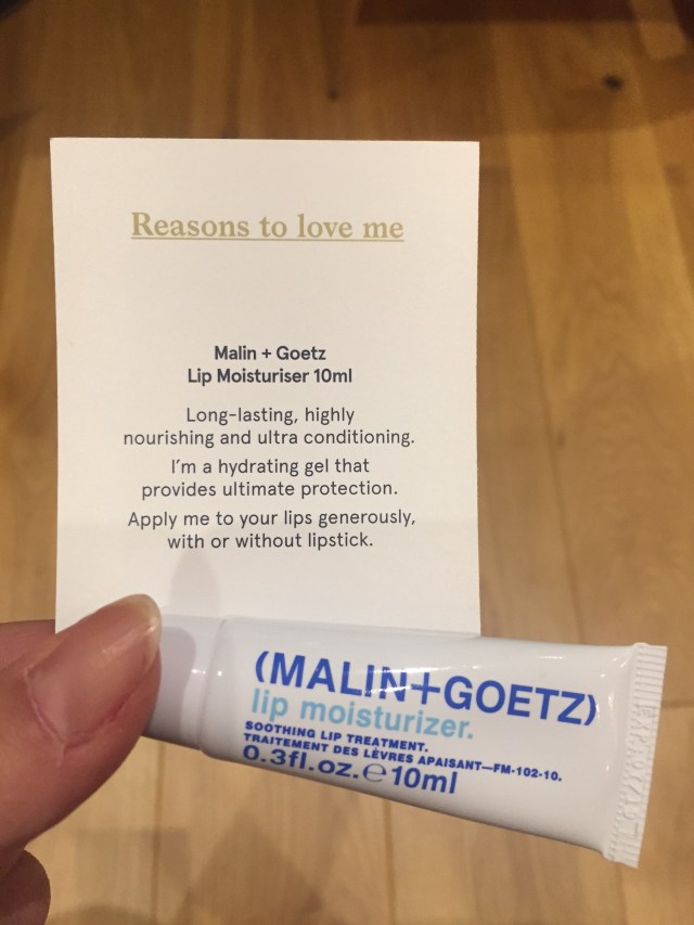 A couple of days ago I opened my advent day 7 gift and was slightly disappointed to find a Malin & Goetz product inside the little box… don’t get me wrong, I’m not ungrateful, but I was cajoled by an over-zealous beautician into buying a Malin & Goetz body lotion to cure my dry legs and not only was it expensive, it didn’t smell very nice and it didn’t even work! My legs were actually flaky dry and that lotion was totally useless, I may as well have been applying water to them! So when I found this lip moisturiser, I was beyond cynical and nearly popped it in my ‘to re-gift’ box….